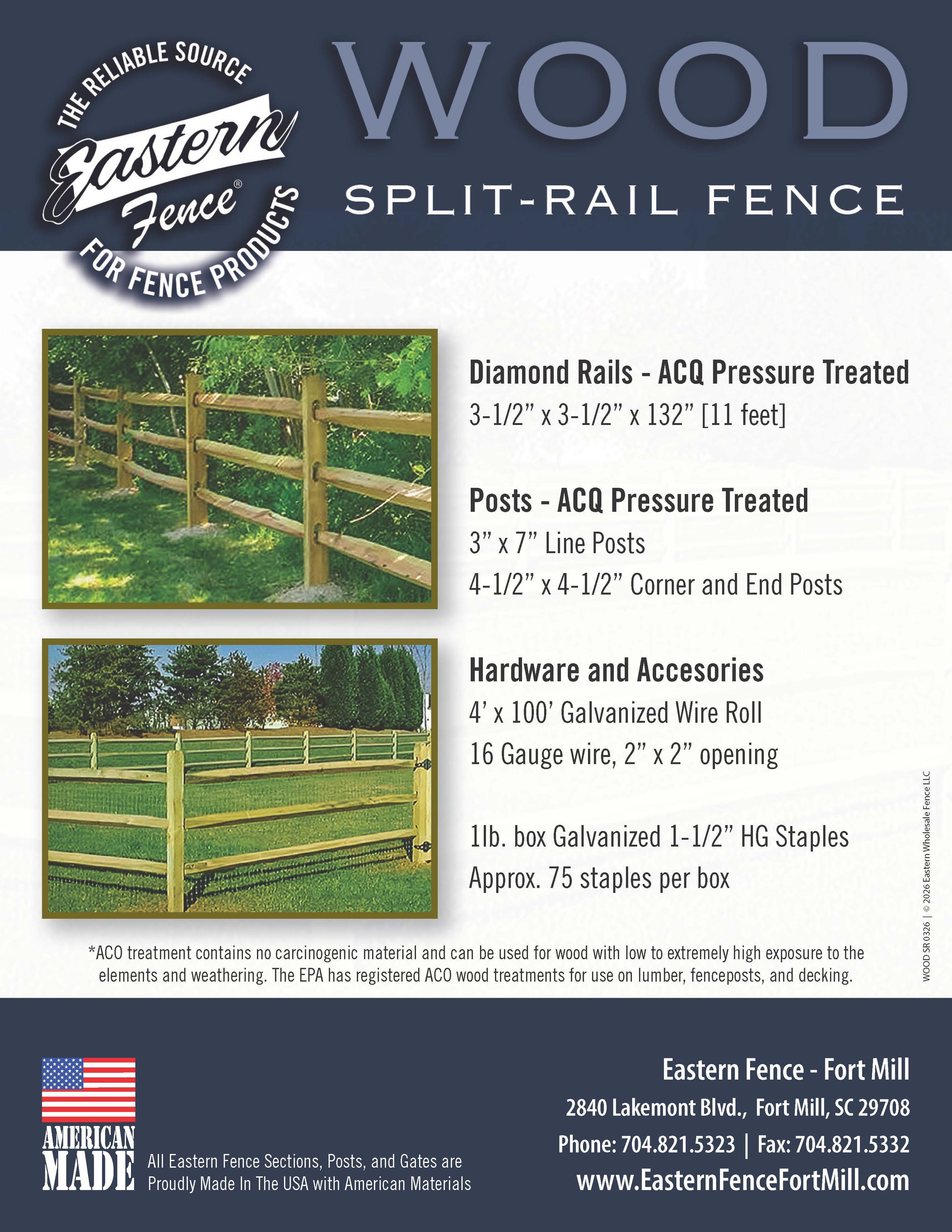 By stocking wood split rail products, Eastern Fence has become the one stop shop for all of your fencing needs. Our split rail products are ACQ pressure treated for long lasting life. ACQ treatment is a non carcinogenic treatment process that is also an environmentally friendly water-based preservative that is free of arsenic and chromium. Eastern Fence also stocks 5” x 3/4" pressure treated, dog ear wood pickets. Our pickets are 'stabilized weather resistant' Ecolife treated. Ecolife treatment reduces cracking & splitting by up to 50% and repels water for up to 3 years along with a lifetime warranty against fungal decay & termite attack.